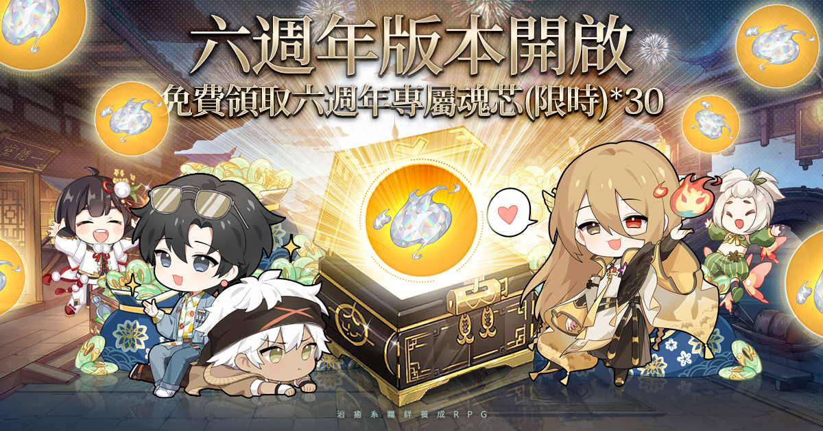 活動說明:活動期間,少主每日回到空桑都會收到一封慶典賀卡——十位食魂將為少主奉上週年祝福!每封賀卡將會附贈一個魂芯,共計可獲得「六週年魂芯」*10!